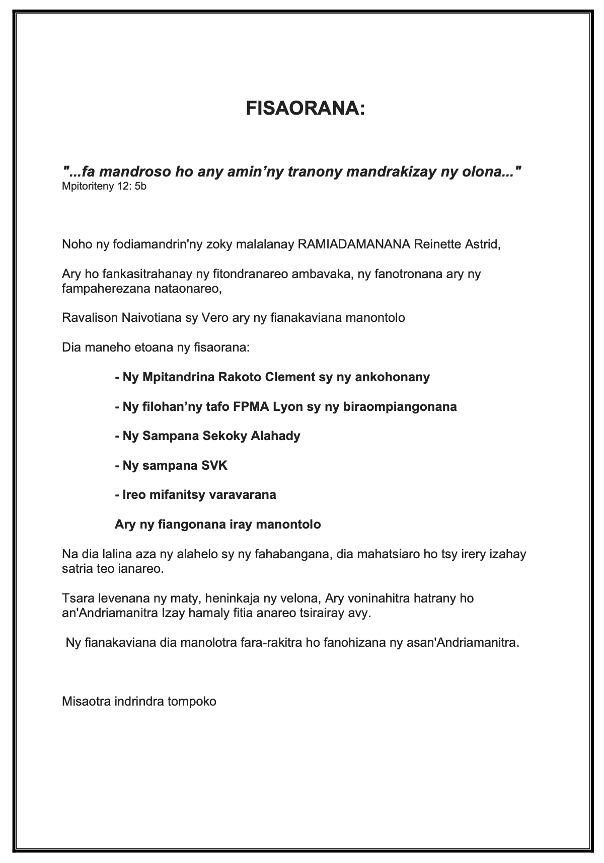 "Filazantsara Herin’Andriamanitra ho Famonjena izay mino."